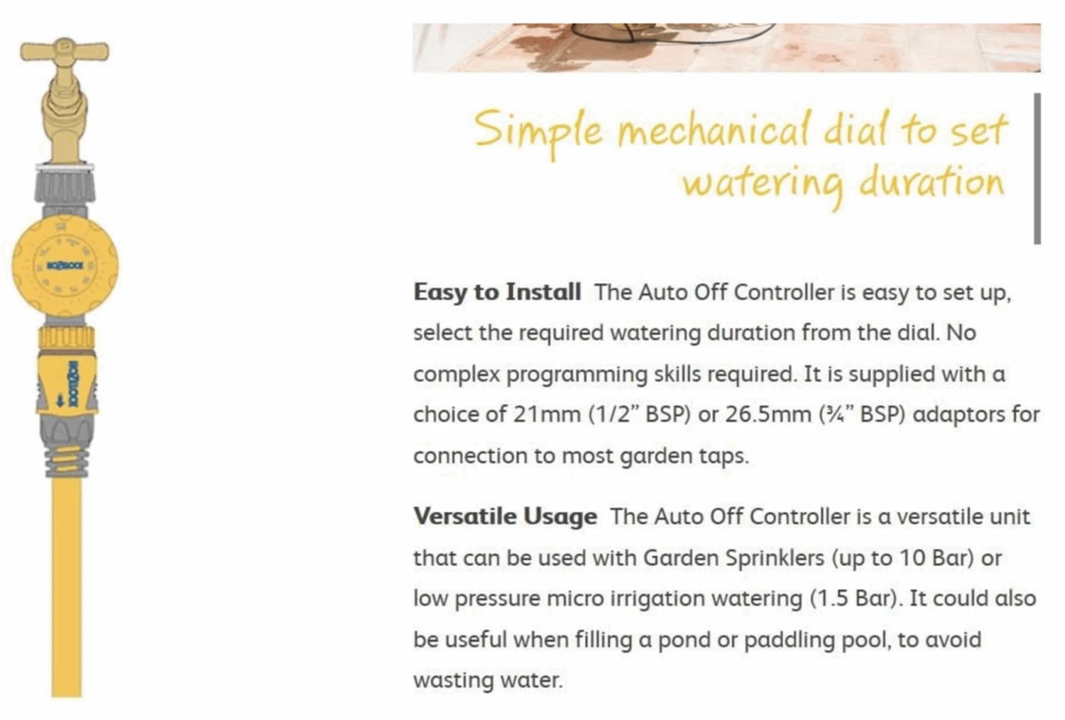 The Auto Off controller is ideal for use with garden sprinklers to prevent you from leaving it running for longer than necessary.