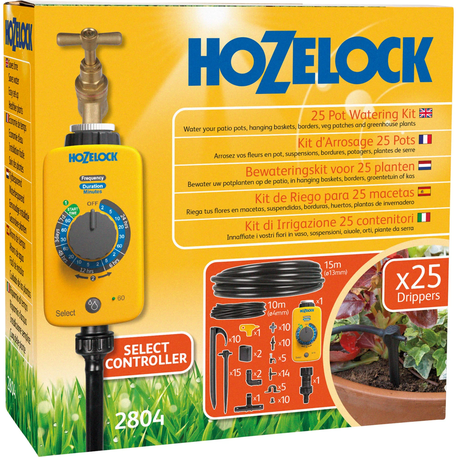 Included in the kit is Hozelock’s best selling Select Controller Timer. Simple and easy to use with 16 pre-set programs to supply water from once a week up to four times a day.