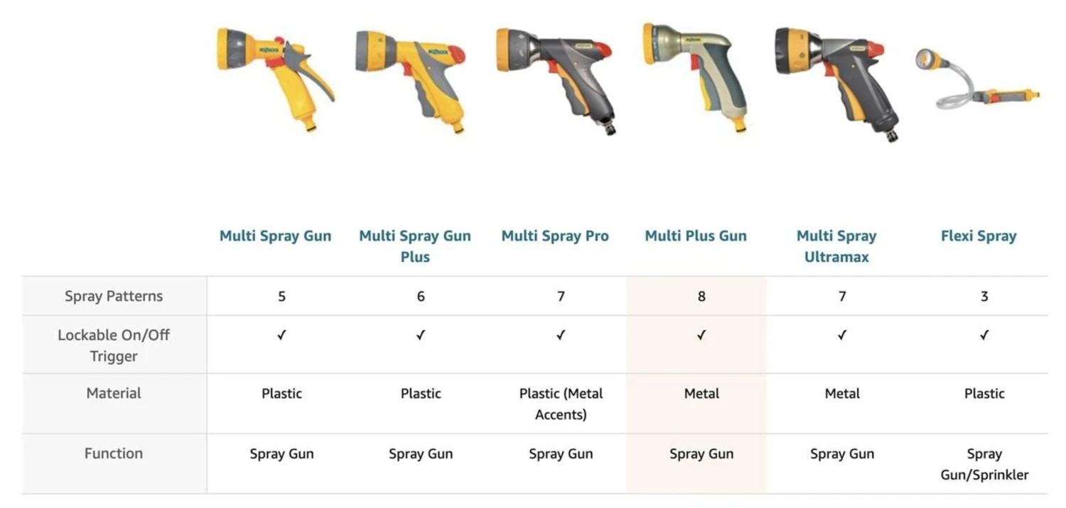 Features Stylish metal bodied gun spray featuring eight varied spray patterns Powder coated die cast metal body. Comfortable, soft touch ergonomic handle. Lockable on/off trigger. Eight spray patterns for all-purpose cleaning and gardening tasks.