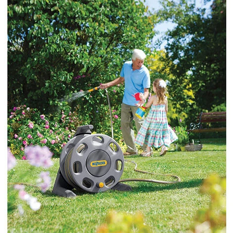 The 30m capacity Hozelock freestanding hose reel, with manual rewind and comes with 15m of multi-purpose hose, threaded tap connector, hose connectors and a hose nozzle. Its perfect for storing loose hose, reducing the risk of trips and the sturdy, free standing, frame allows for quick & easy rewinding