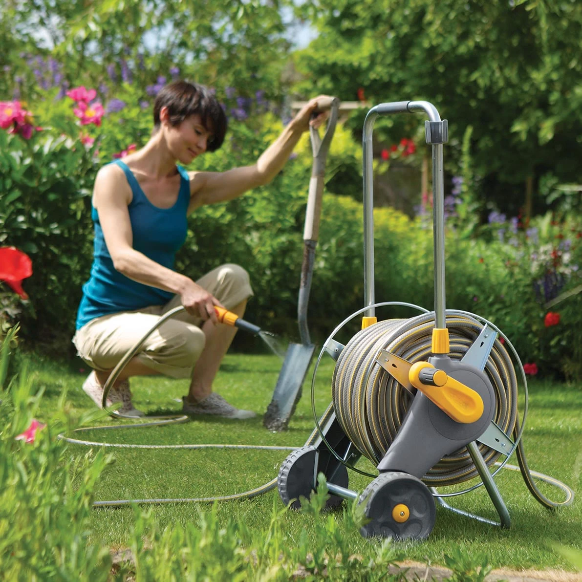 Hose rewinding has been made easier, thanks to the perfectly round, full size drum which rotates freely under load. Includes hose and tap fittings, plus spray nozzle.