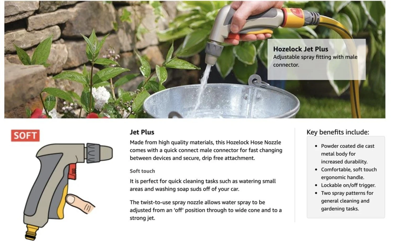 Stylish metal bodied gun with a choice of jet or cone spray patterns Powder coated die cast metal body. Comfortable, soft touch ergonomic handle. Lockable on/off trigger. Two spray patterns for general cleaning and gardening tasks.
