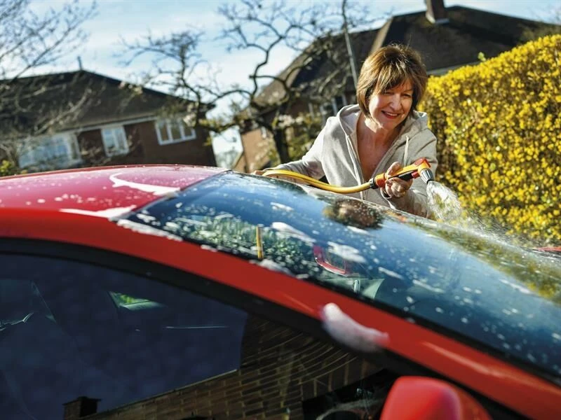 Hozelock Jet Spray Gun with a lockable front trigger, which turns water on and off, and an easy-to-use thumb-operated flow control switch.