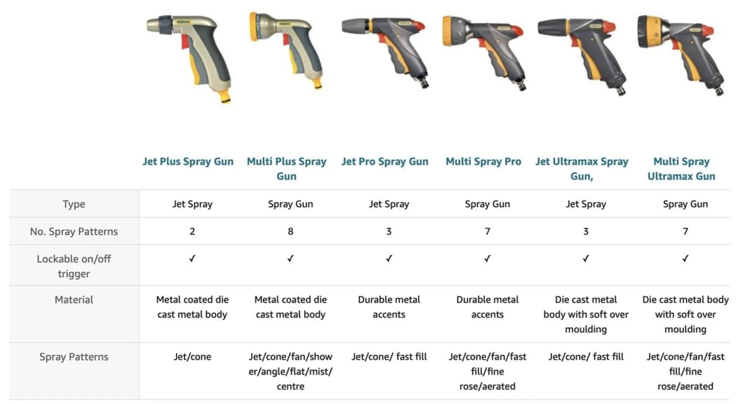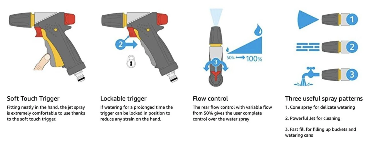 Features Die cast metal body for ultimate strength and durability Lockable trigger and separate flow control Three spray patterns