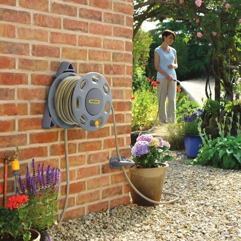 The wall-mounted hose reel from Hozelock can hold hoses of up to 30 m in length, making it ideal for medium to large gardens.